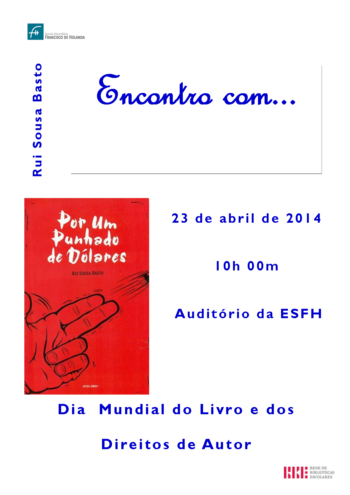 No dia Mundial do Livro, a nossa escola recebeu, uma vez mais, Rui Sousa Basto, o autor dos "Contos do Efémero" que nos agracia, agora, com mais uma série de micro-contos, sempre surpreendentes, com um estilo muito próprio deste autor. A apresentação da obra "Por um punhado de dólares" foi, também pela segunda vez, da responsabilidade da professora Rosário Ferreira. Encontro muito agradável, a repetir...